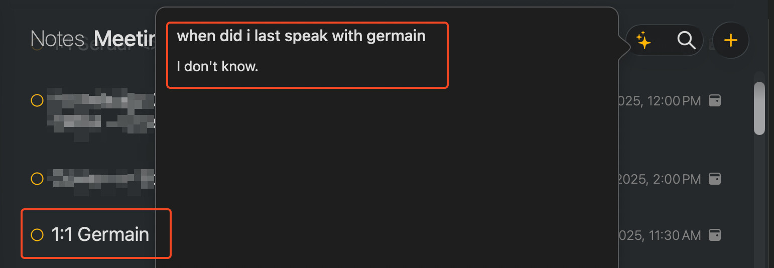 Ask Agenda certainly has limitations. We wanted to get a foot in the door, but the on-device LLM is underpowered. We don’t actually give it the date info about the notes. Perhaps we can include that too. In future, you should be able to do a lot more with it, perhaps even automate some stuff.