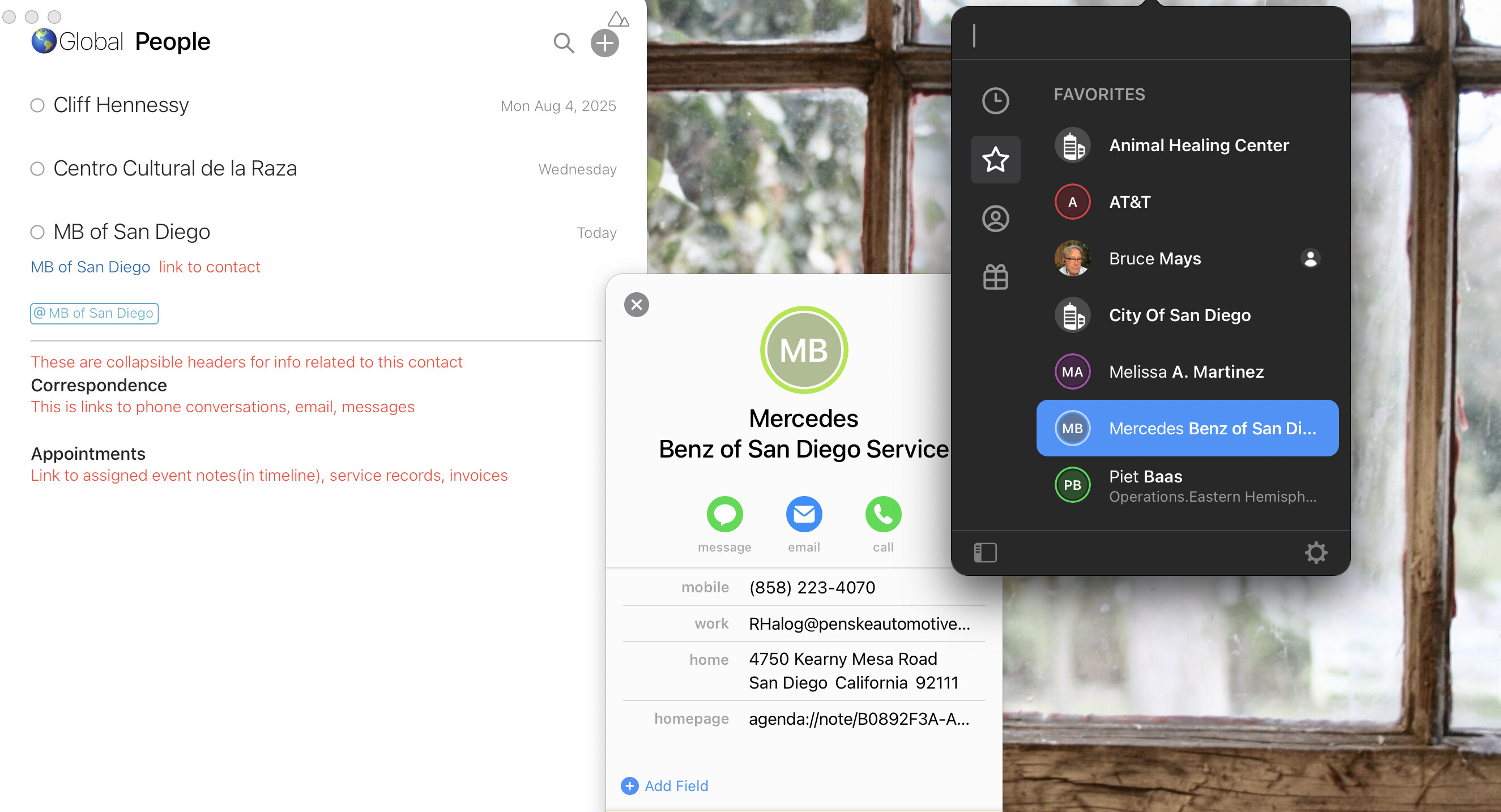 I would also like to see contacts linked to @Person and associated email addresses. Sending an email to Agenda is also my favorite way to communicate with the Windows world.