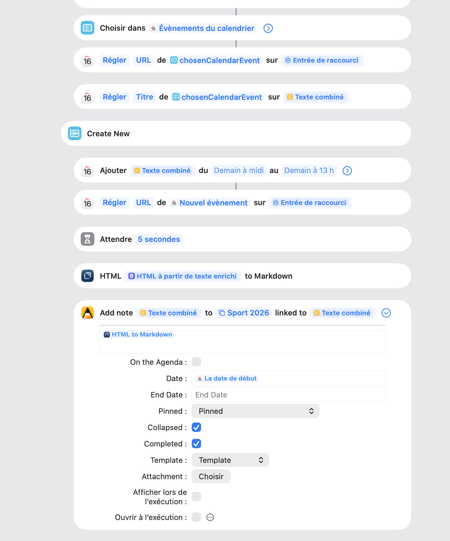 On the Mac it works great! I start the Shortcut from Raycast with some short text and the event and note are created and linked just as expected. It needs the 1 second wait to work reliable, though.