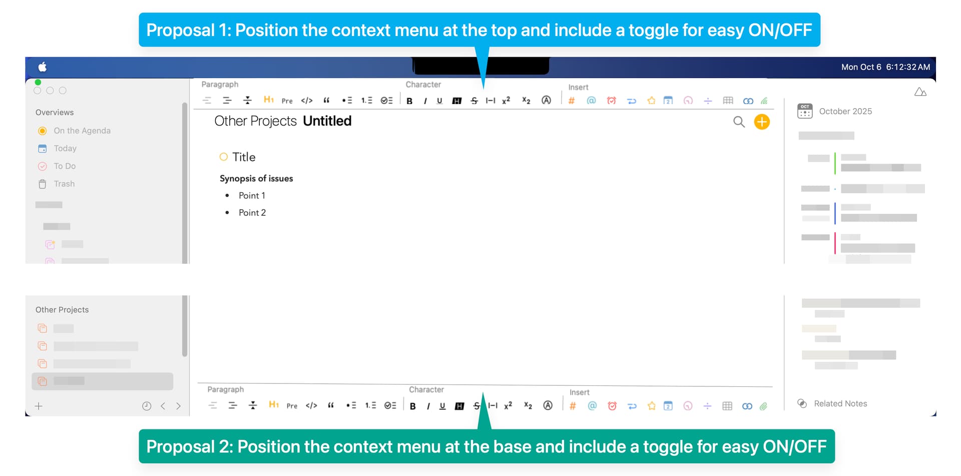 I recommend moving the context menu to either the Top or the Base of the screen for easier access.