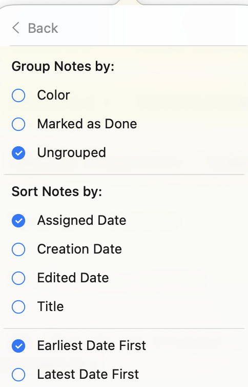 As you can see, it is rather unclear what is taking precedence as I apply these conditions. The note marked for Today in 2.5 hours is split apart from the notes that are for today by a couple notes with no date. If this is because those notes are checked (not a part of the filter), why are there undated notes both at the top AND bottom of the checked notes?