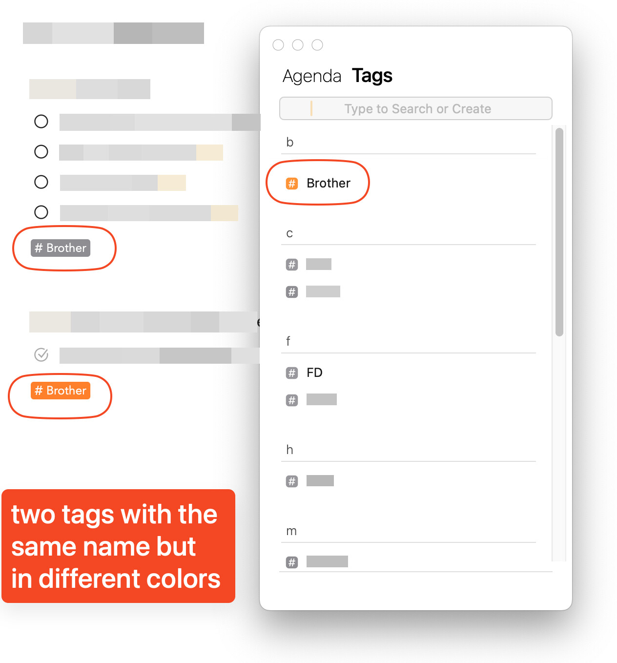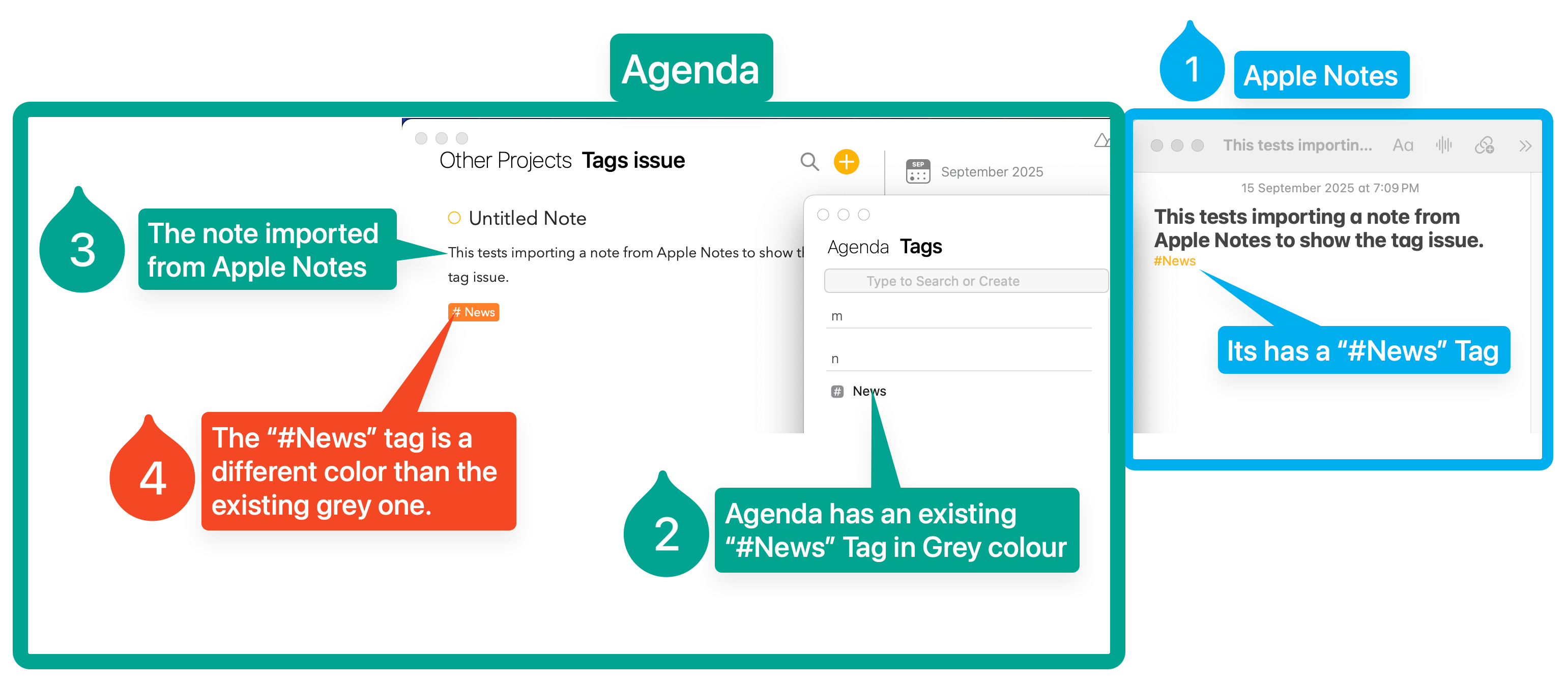 The second issue pertains to importing a Note from the Apple Notes app. The Tag that gets imported is always in orange, even if there is already a grey Tag with the same name in the Agenda app. Why does this happen? Does this mean I will end up with two identical Tags in different colors?