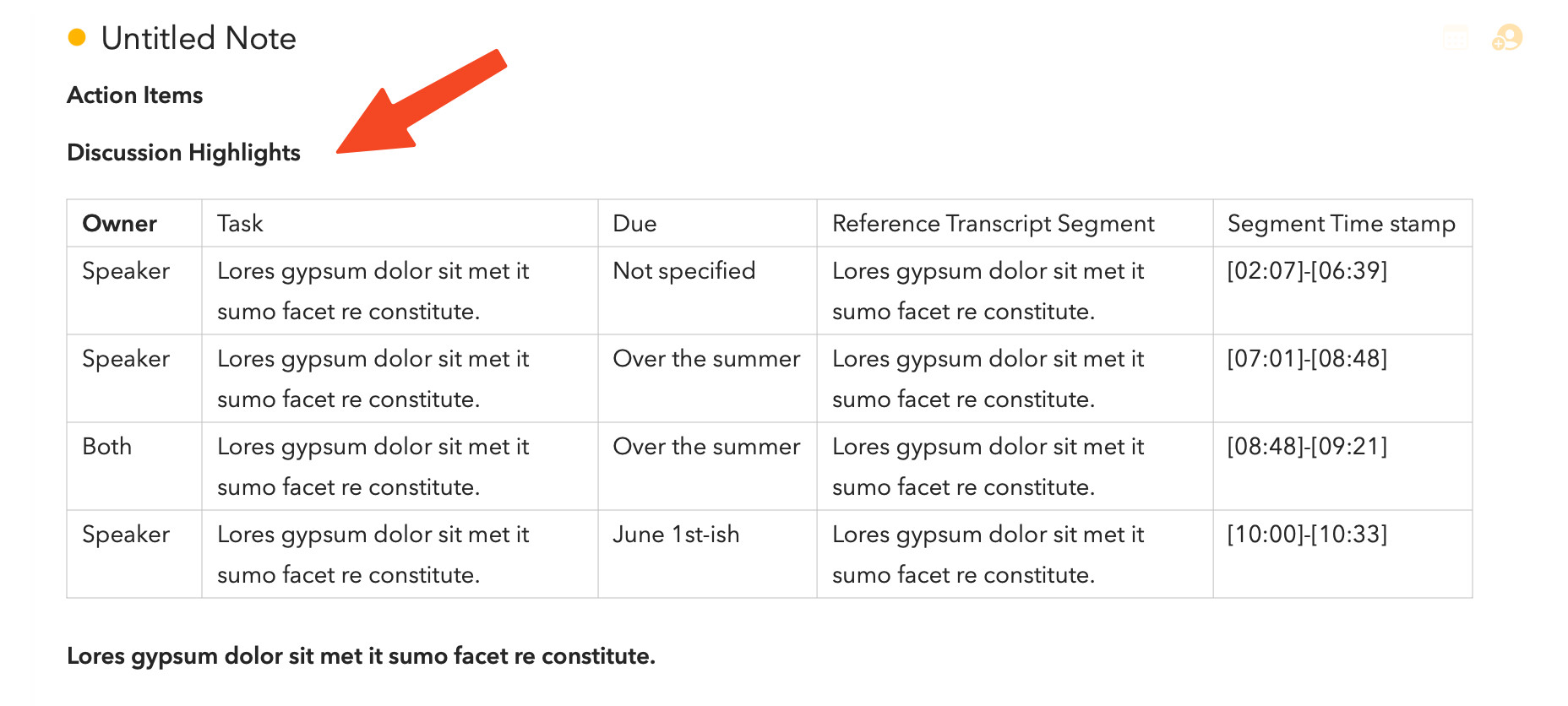 | **Owner** | Task | Due | Reference Transcript Segment | Segment Time stamp |