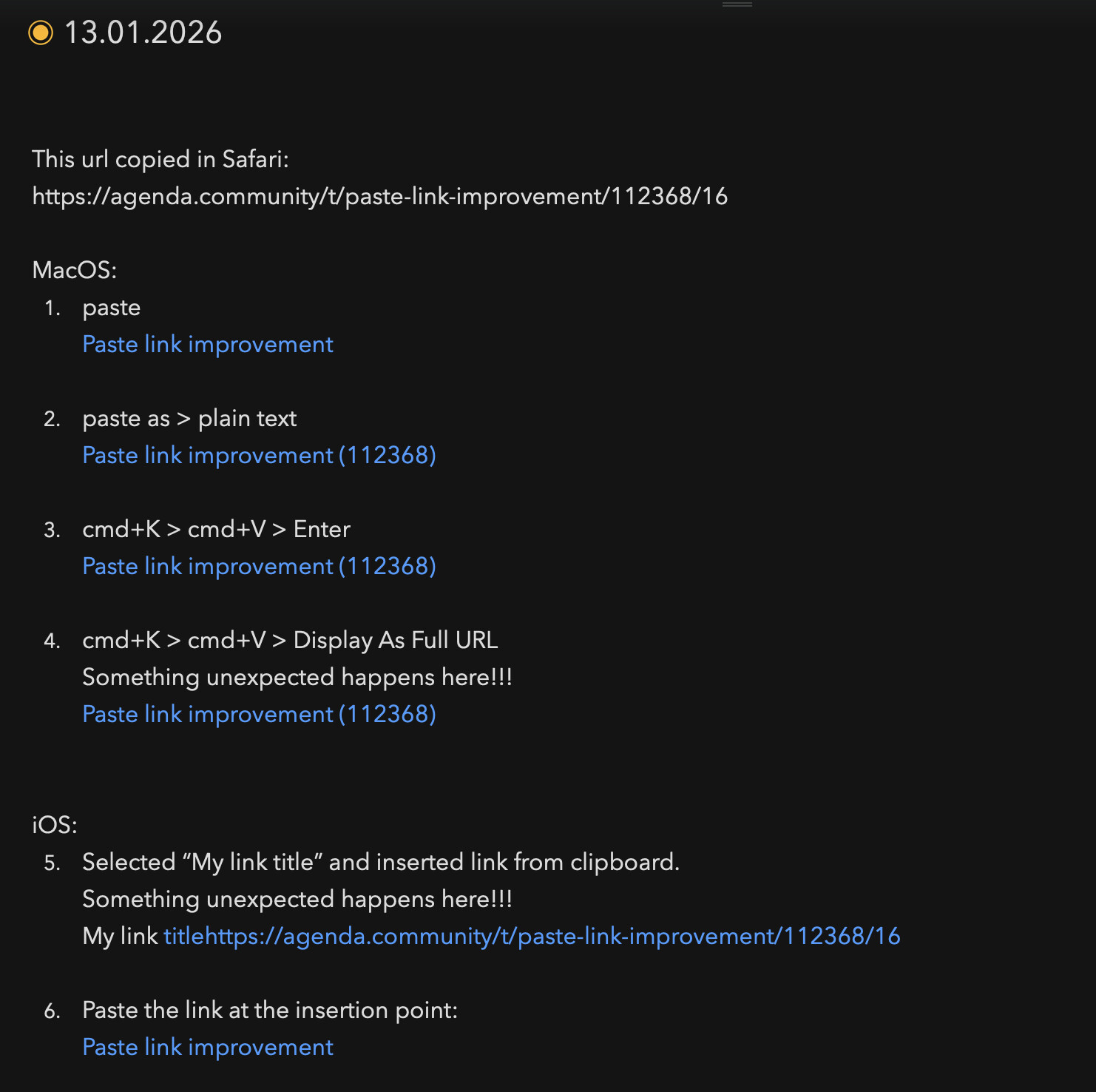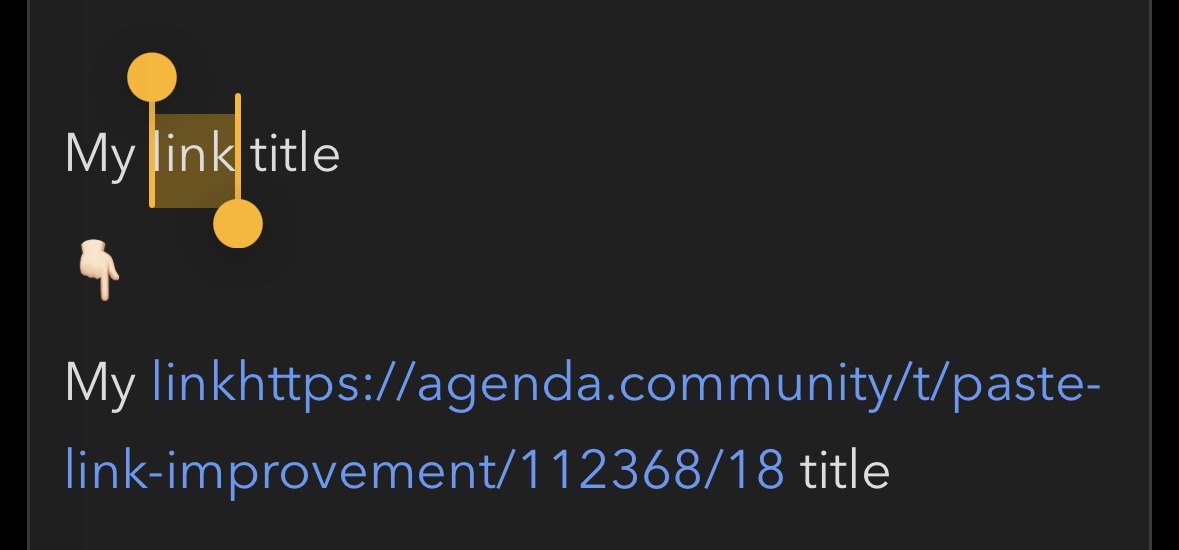 One little workflow improvement I’ve used in a number of apps like Obsidian, Roam Research and Missive is that to add a link to some text, you can simply select the text and paste the link. The text will automatically become a link without having to open an ‘Add/Edit Link’ panel. It’s become so ingrained in me that I keep trying to do it in Agenda, so I thought I’d add a little request for it here
