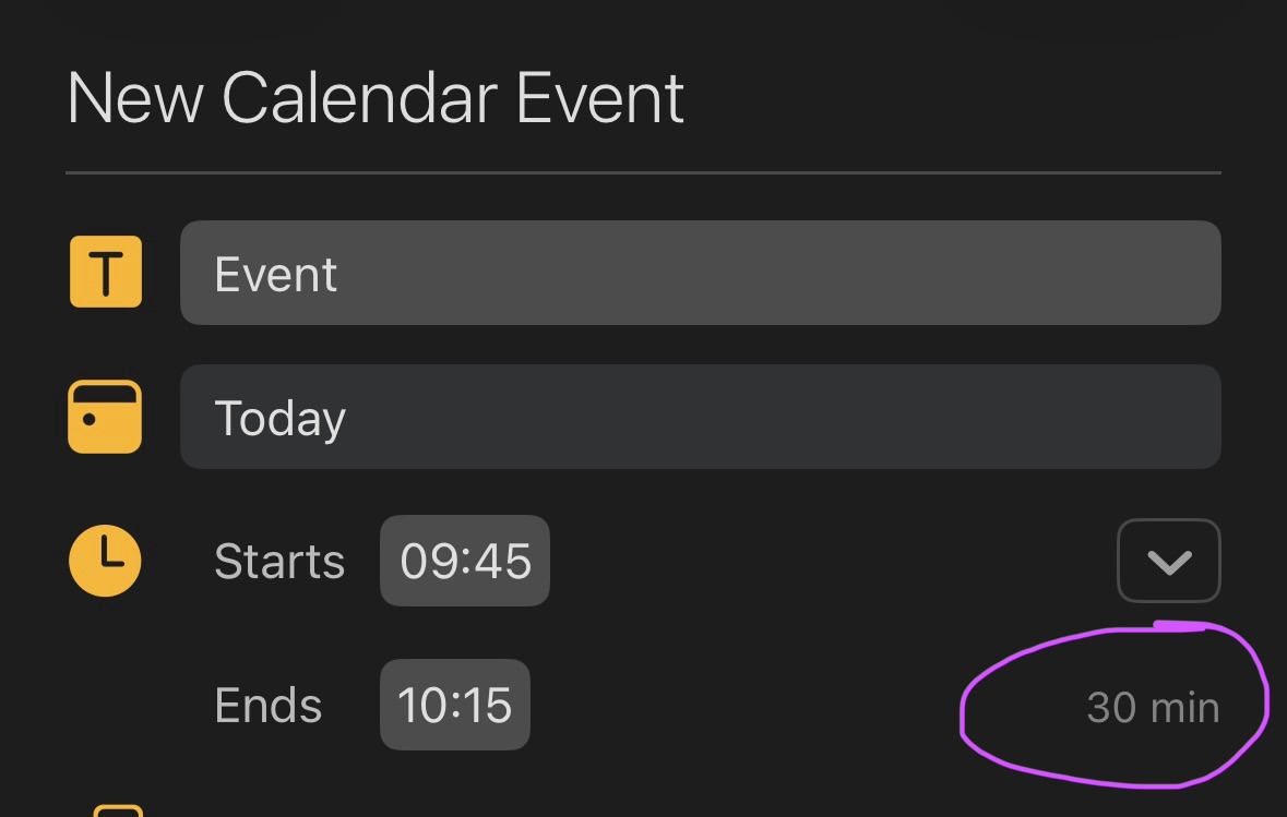 I don’t think you would see the 30 minutes, other than that perhaps you could click the event and it would show a popover very similar to what reminders does. Ultimately, you see the 30 minutes in your calendar. That’s the whole point.